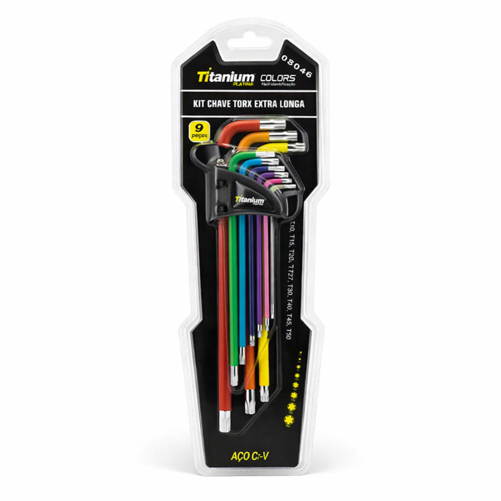 O Jogo de Chaves Torx Extra Longas Titanium Platina é ideal para quem precisa de alcance, força e precisão em serviços profissionais. Fabricadas em Cromo Vanádio (CRV) com acabamento colorido, as chaves garantem alta durabilidade, resistência à corrosão e identificação rápida das medidas, facilitando o trabalho no dia a dia.